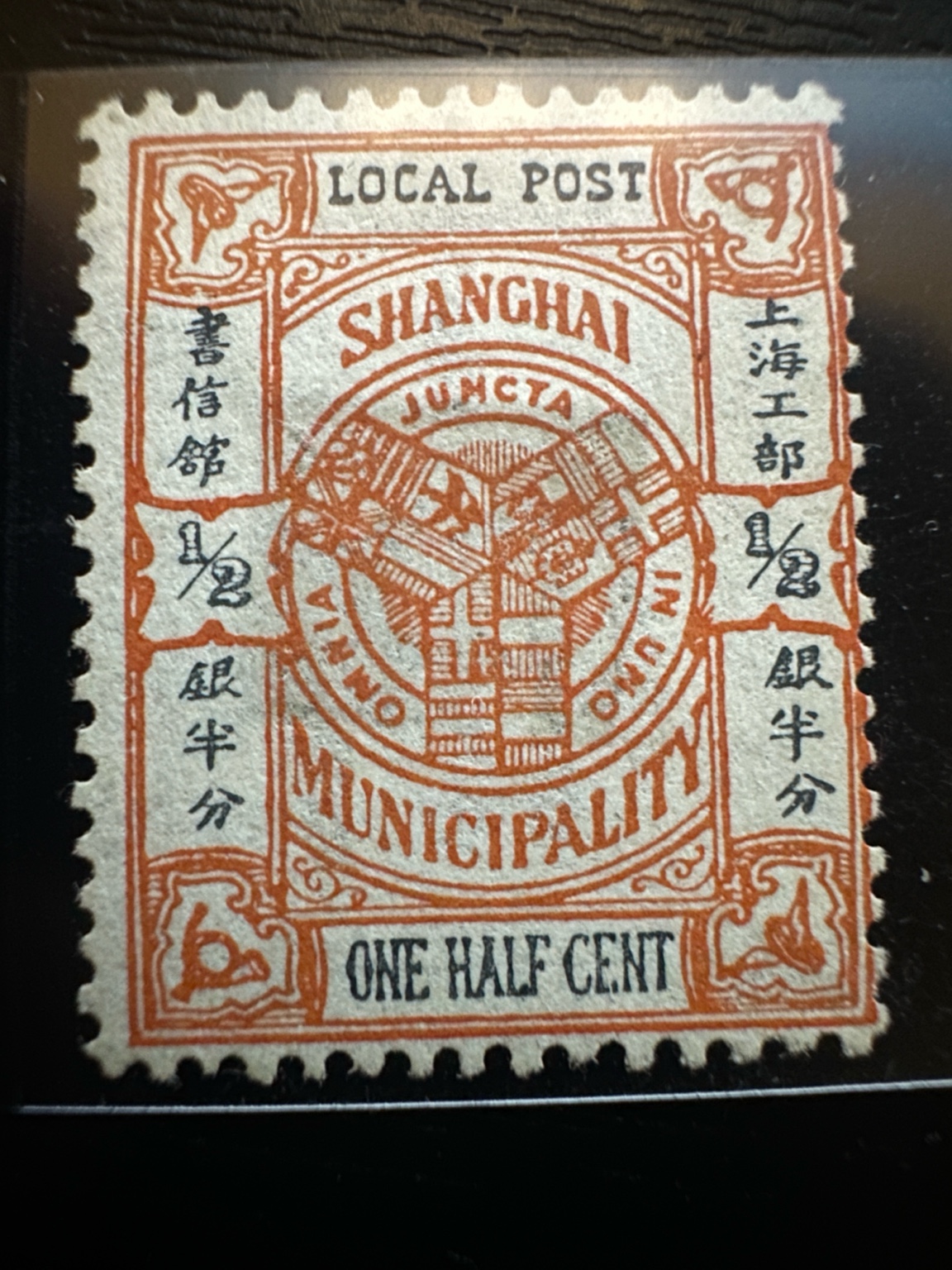 Il porte la mention “Shanghai Municipal – Local Post” ainsi que la devise latine “Juncta Juvat” (l’union fait la force), entourant un motif central symbolique. La valeur faciale est indiquée à ½ cent (One Half Cent), également exprimée en caractères chinois.