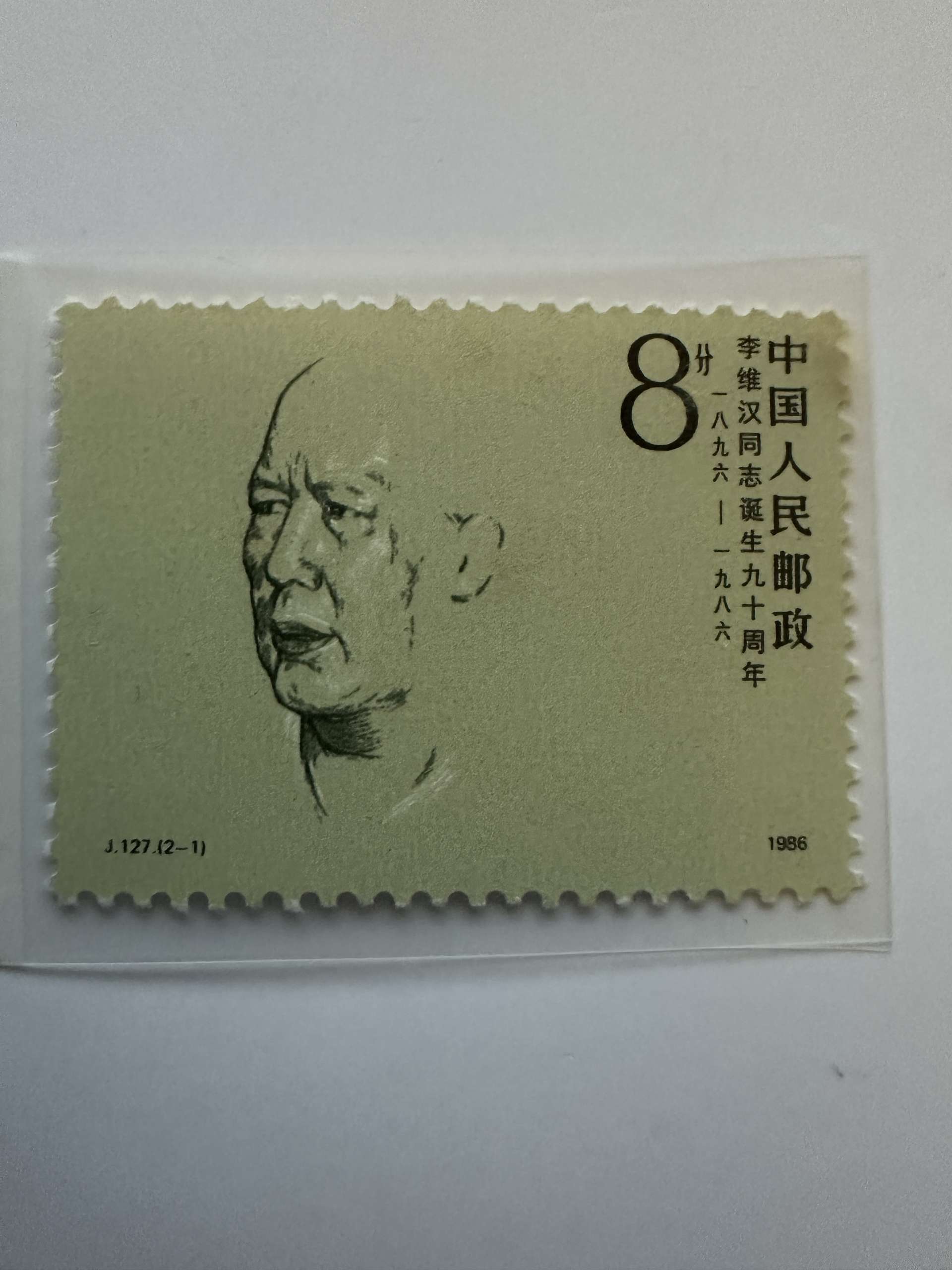 Émis le 2 juin 1986, ce timbre commémoratif chinois célèbre le 90e anniversaire de la naissance de Li Weihan (1896-1984), figure majeure du Parti communiste chinois et acteur clé de la construction politique moderne de la Chine. Numérotation officielle J.127 (2-1). Valeur faciale : 8 fen. Format 40 x 30 mm. Dentelure 11 x 11,5. Impression en héliogravure couleurs. Timbre recherché par les collectionneurs spécialisés en histoire politique chinoise et émissions commémoratives des années 1980.
